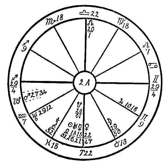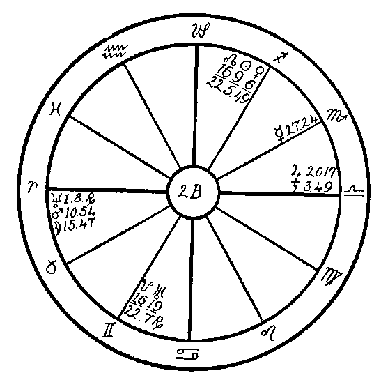 We find that there are common signs on the angles, which is a testimony of a flexible character, difficult to rouse from sickness or trouble into which the native may fall. The Moon in conjunction with Saturn in Aquarius, the sign which governs the ankles and lower parts of the limbs, is evidence of a poor circulation; and Uranus in Leo, the sign of the heart, in opposition to the Moon and Saturn shows that there is a fluttering of that
