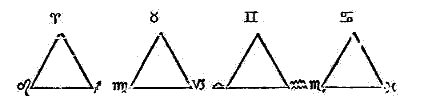 The symbol of the trine is the triangle. In astrology the trine is considered harmonious and benefic. Then we have the signs which represent the four elements, forming the fiery, earthy, airy, and watery triangles.