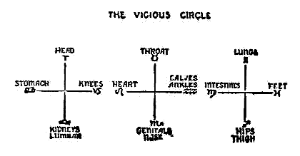 This is the case of a woman afflicted similarly to the one in No. 2B, but the reverse condition is found as regards the aspects of the planets. Nothing but adverse aspects exist with the exception of one, Mars trine to the Moon. We find the Sun, the life giver, in the sign Aries, restricted by a conjunction of Saturn and in opposition to Jupiter, ruling the arterial blood, placed in the sign Libra, ruling the kidneys. These three planets are also square to the Moon in Cancer, the stomach. Here we find the kidneys (the janitor), the stomach, (the cook), and the head of the home, Aries, all afflicted, careless, and not doing their work. How can a home be kept clean and fit to live in if all the workers are on a strike? The dust will accumulate, an naturally the tenant will be very uncomfortable. We find the stove full of ashes; it will not burn, and the smoke is escaping through the doors and windows instead of through the chimney.