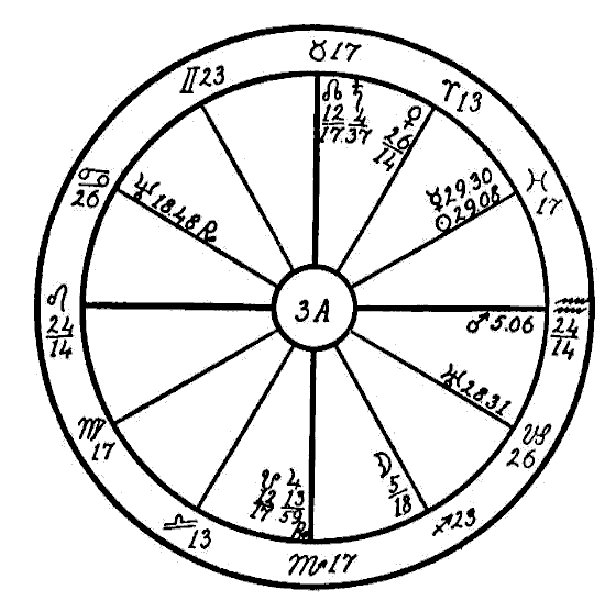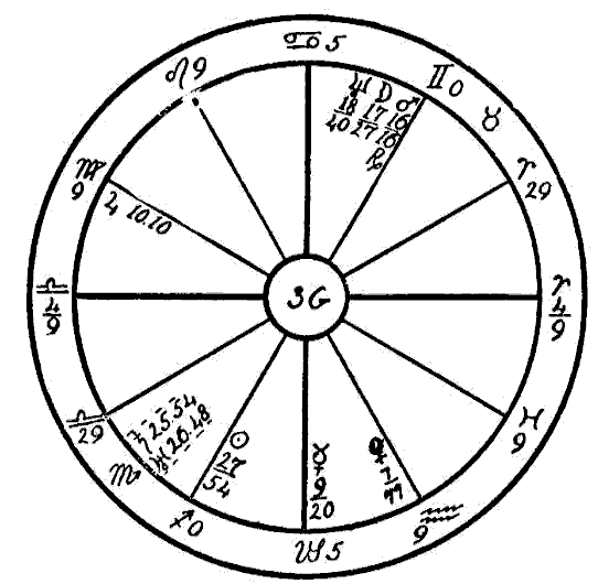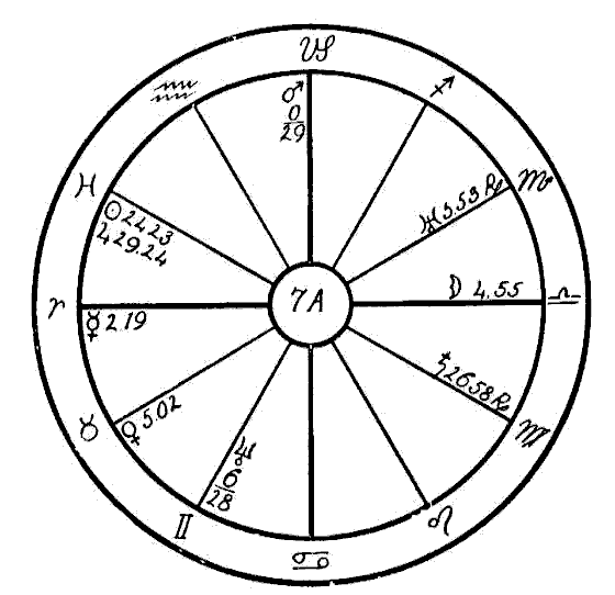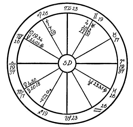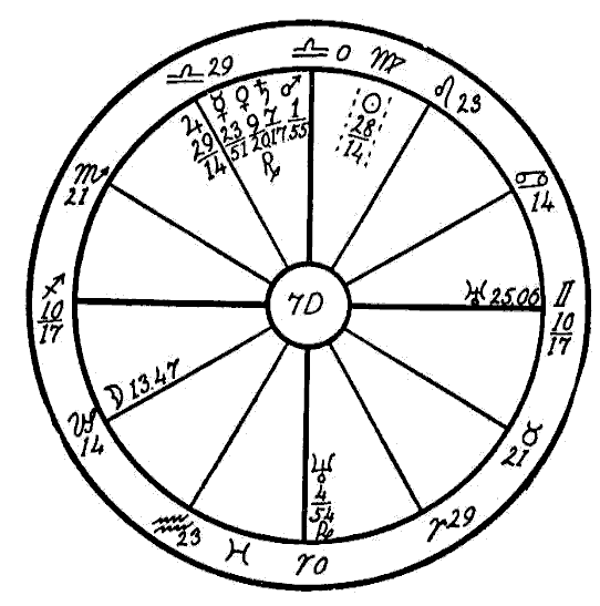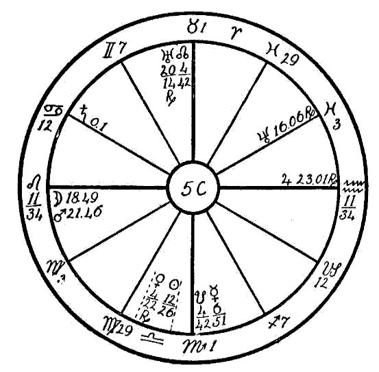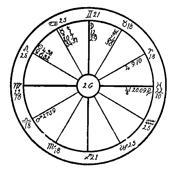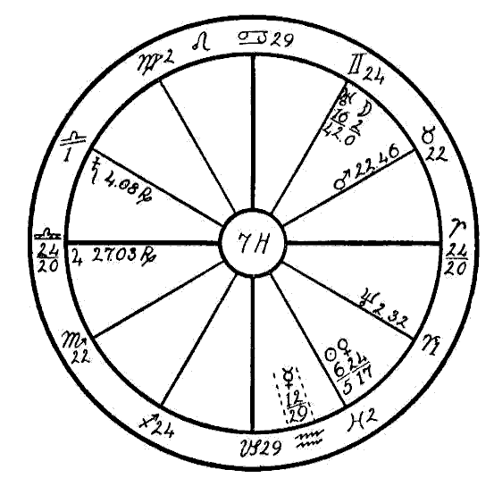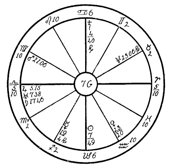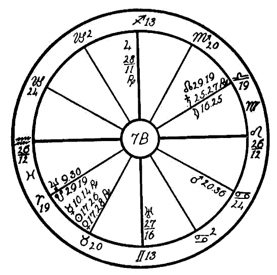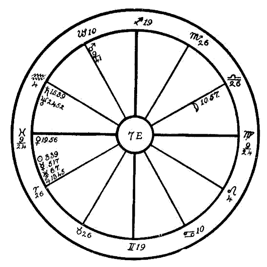 The common sign of Virgo is on the Ascendant and common signs on all the angles. In this horoscope we will show the law of the vicious circle, which the doctors are so interested in and which is so baffling, and how this law proves the truth of the statement quoted from the Cosmo-Conception.