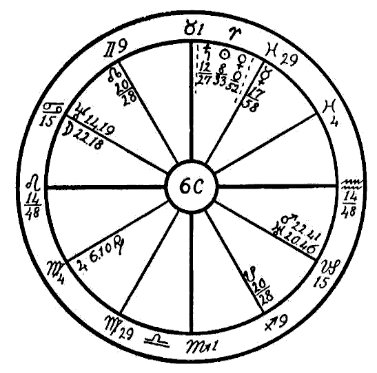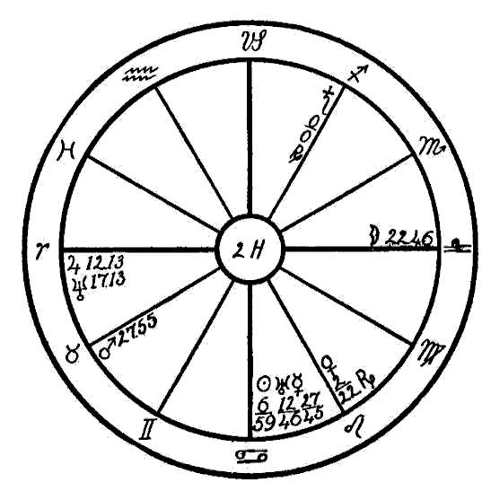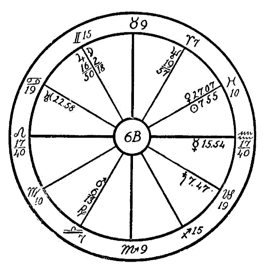 In the second case we will use a plain figure, as the hour of birth is lacking. This is the horoscope, numbered 8B, of a woman born November 12th, 1895.