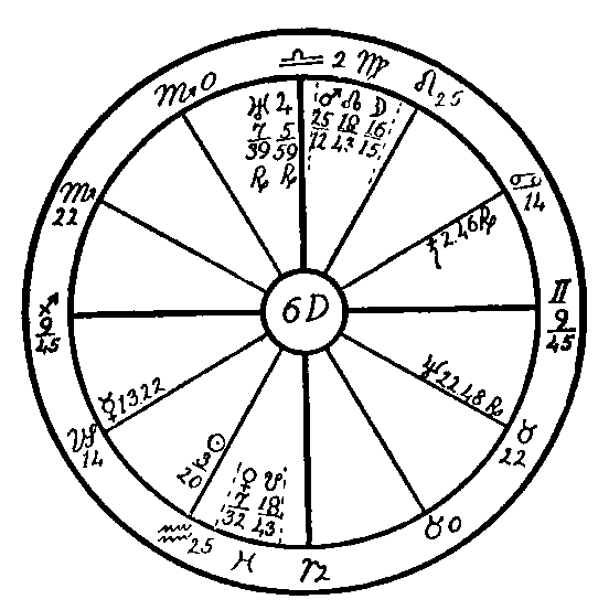 This is not all. We find Mars, the planet of surgery, conjunction Antares. When one of the malefics is placed near the nebulous spot Antares, Sagittarius 8, and either of the lights are afflicted, trouble with the eyes is quite certain to result. In this horoscope both the Sun and Moon are afflicted, one by a square of Saturn, the other by a square of Mercury. We may therefore judge that this woman will have trouble with her eyes, and as Mars is placed in the twelfth house, which rules confinement in hospitals or kindred places, it is evident that she is facing a grave danger from that source.