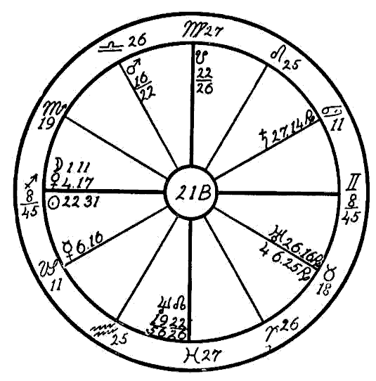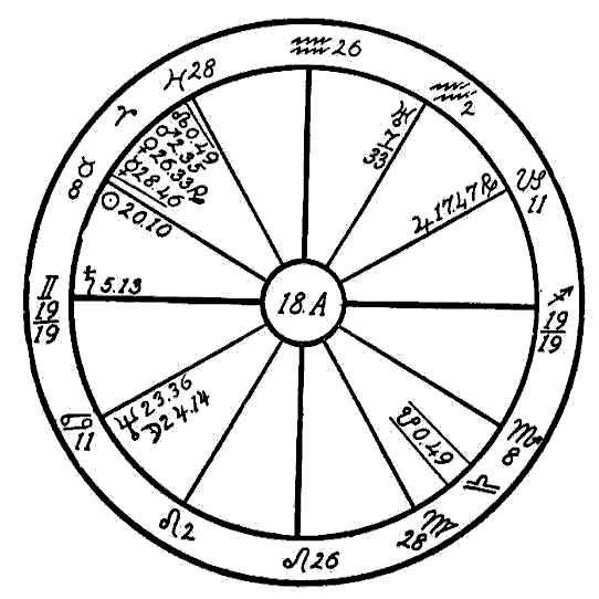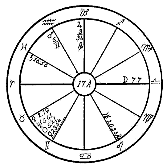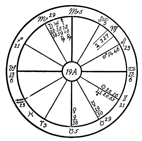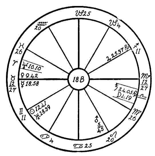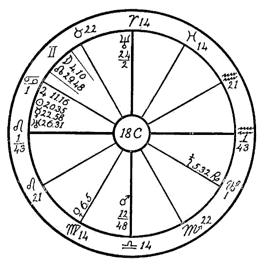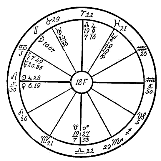 The Moon is in its own sign, Cancer, square to Jupiter. Therefore the native can expect little help from the Moon, and so we must look to the planet Mercury to see if the mind is to receive assistance to overcome the square of Neptune to Saturn. Mercury is retrograde, which makes its influence latent, and in the sign of its fall, the common and negative sign of Sagittarius. Mercury, however, while weak by sign and retrograde, is helped by a sextile of Jupiter and by one of Saturn. This will save the native from insanity.