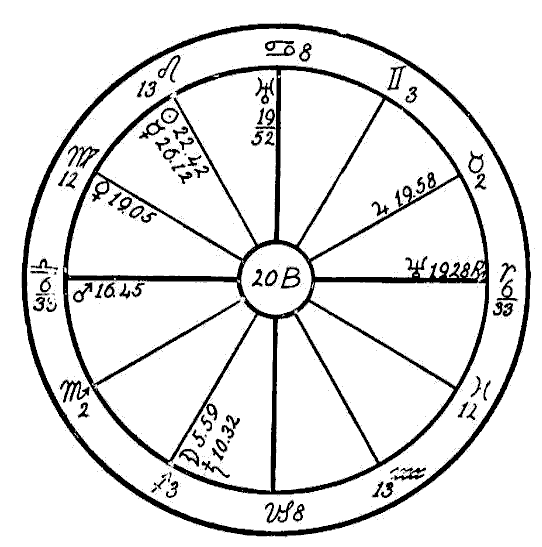 In the case of horoscope 20D, that of a man born August 25, 1867, we find Saturn in Scorpio, a fixed sign, square to Venus and Mercury in Leo, the sign ruling the heart. We again find some trouble with poor heart action; but the most disturbing affliction is found in the stomach, for the Moon and Uranus are in conjunction in the sign of Cancer, which has rule over this organ, and both are square to the inflammatory Mars, Uranus also being square to Neptune, all in cardinal signs. In this horoscope we find the seat of the trouble in the stomach, showing impulsive and unnatural habits regarding food, with a tendency to bolt the food and also excessive drinking with meals, which would cause the stomach to become distended, thereby pressing upon the heart and interfering with respiration.