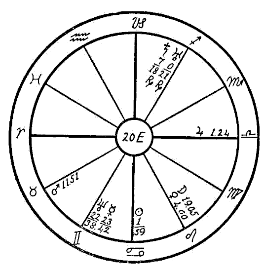In horoscope 20E, that of a woman born June 23, 1898, we find a very different cause, and we may diagnose this as a real case of hay asthma. Neptune is conjunction Mercury in the sign of Gemini, which has rule over the lungs. From the indications of personal appearance we should think that this young woman had Virgo rising with Gemini in Midheaven, giving Mercury as the life ruler. Neptune, being the higher octave of Mercury, has rule over the nervous system. Neptune's influence is similar to that of Saturn — constricting, astringent. When in Gemini, we may expect a disturbance in the bronchioles, especially during the summer months, as was the case with this young woman, whose trouble was caused by the inhalation of the pollen of certain grasses and flowers.