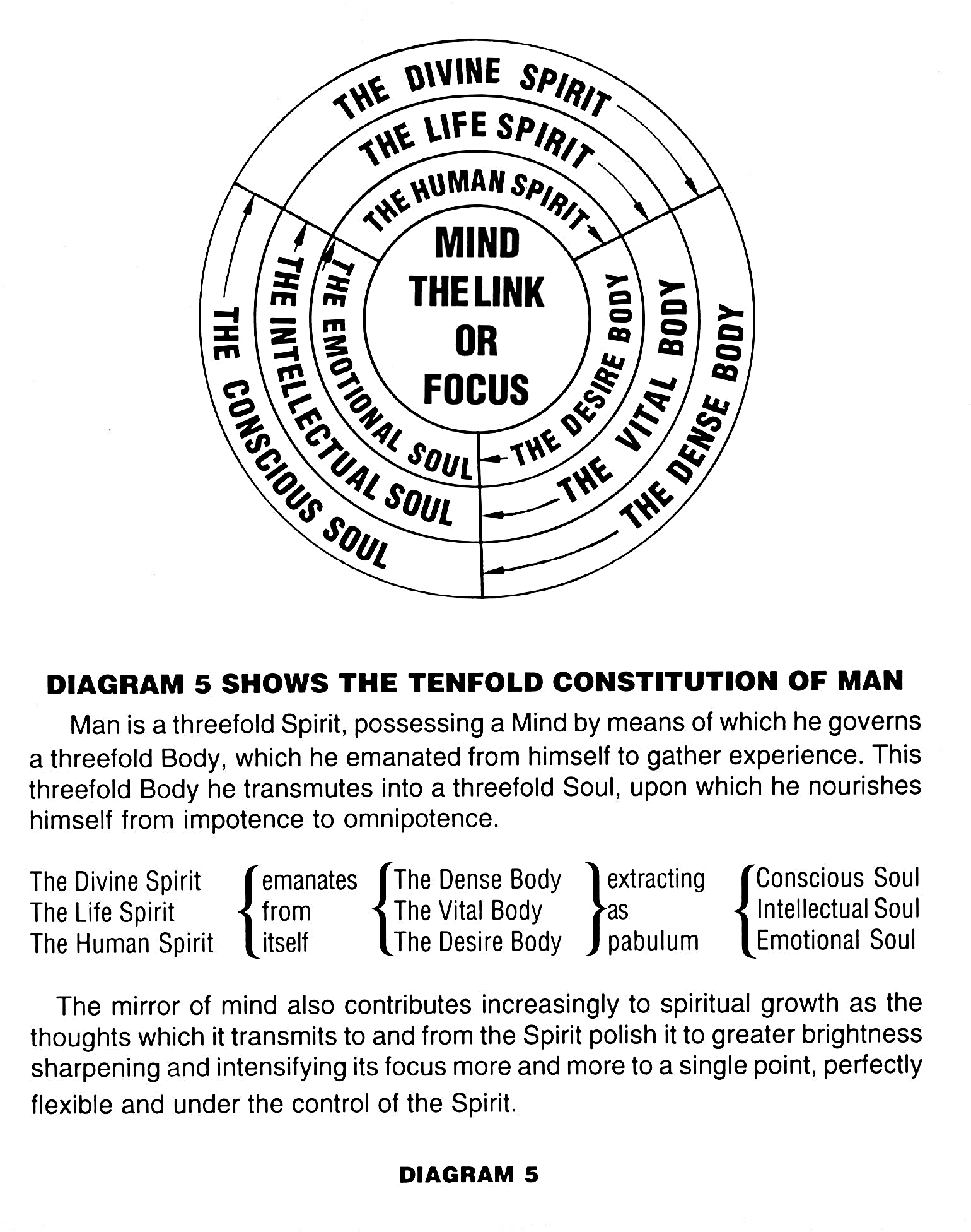 (4) The Mind, which is a mirror, reflecting the outer world and enabling the Ego to transmit its commands as thought and word. It is the link between the Spirit and its bodies. At the present time it is but an unformed cloud, but will eventually be as well organized as man's other bodies.
