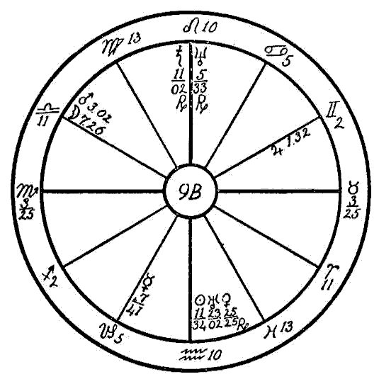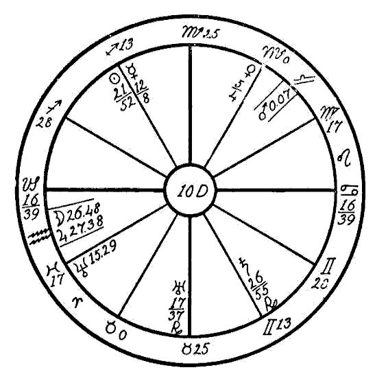 In 1914 we find the progressed Sun in the first degree of Scorpio, and the progressed Moon in the sign Aquarius forming an opposition to the Ascendant and the radical Jupiter in Leo. It is also coming up to a square of the radical Saturn, Mercury, and Uranus in Scorpio. In this same year two new Moons afflicted the three latter planets. The one on January 26th fell in five degrees of Aquarius in opposition to Jupiter and square to Saturn and Mercury. On April 25th the new Moon fell in four degrees of Taurus, square to Jupiter and opposition Saturn and Mercury. This was the time when —