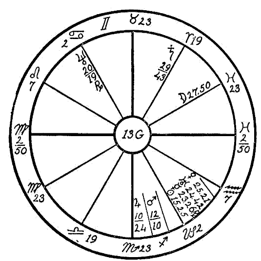The planets in the 12th and 6th houses when afflicted are the most detrimental to health, and in this horoscope we may look to the stomach as being the seat of the trouble. Let us find the reason for this assertion: