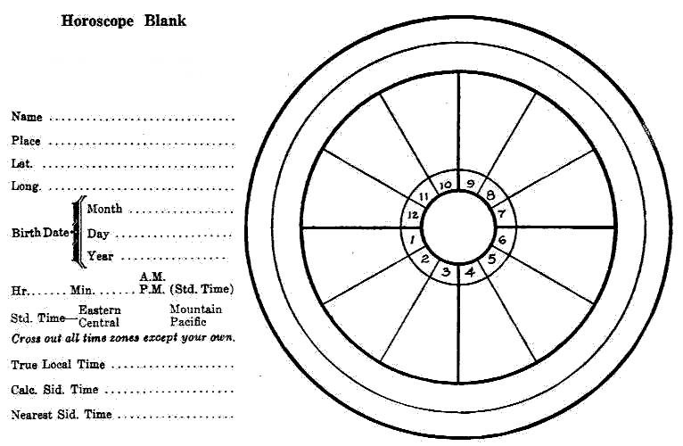 In the first five Independent Study Modules you learned how to find the Sidereal Time of a birth and to place the proper sign and degree of the zodiac upon each of the twelve houses. The last three Astrology Independent Study Modules have been devoted to calculation of the planets' places in the zodiac, and now the time has come to enter them in the horoscope. When they have been entered in their proper houses, the horoscope is complete. This will, therefore, be the subject of our present Astrology Independent Study Module.