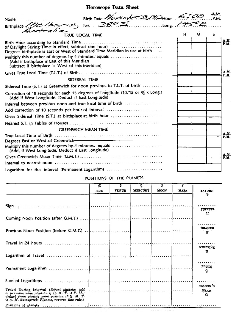 1. When you have studied this Astrology Independent Study Module, please set up the practice horoscope below (Birth Place: Melbourne, Australia; Lat.: 38 deg. S.; Long.: 145 deg. E.; Birth Date: November 23, 1912; Birth Time: 6:00 P.M.), and email it to us. (optional)