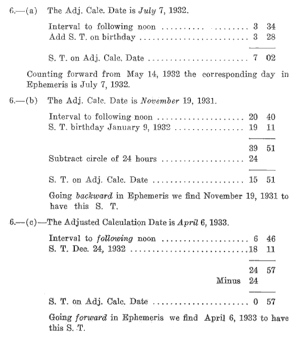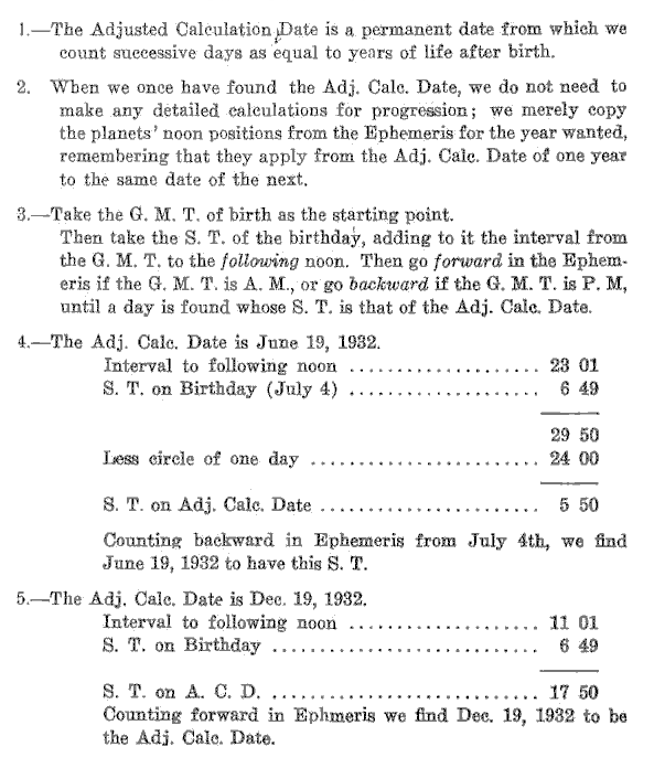 In Astrology Independent Study Module No. 49 we have endeavored to explain thoroughly the method of finding the Adjusted Calculation Date, a date which is used for the simple progression or advancing of the horoscope for any year after birth.