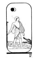 The meaning of this glyph is by no means readable at first sight. Its simplest interpretation refers to the worldly man without knowledge of spiritual realities, who may fancy himself wise and powerful. The staff of worldly wisdom upon which he leans is frail, and the double bag in which he carries his worldly wealth is of no avail to save him from the crocodile which he does not see. His eyes are blind to the light of the spirit and its truth which, represented by a sun partially obscured by clouds, is nevertheless shining in the sky, visible to those who have eyes. The picture may be taken as representing the Epicurean materialist who lives but to "eat, drink and be merry, for tomorrow we die." In some Tarot systems, this man is not blind but only blindfolded, suggesting that he chooses to walk in the darkness rather than the light, regardless of consequences.