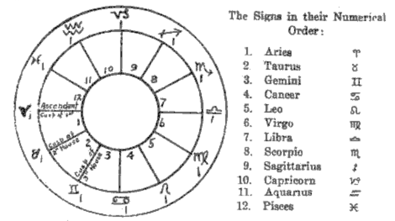 The central circle is supposed to be the earth, and you who are looking at it are supposed to be out in space toward the north pole looking down on a plan of the earth at the birthplace, and hence you are looking south. (This is the case when you are in the northern hemisphere. If you are in the southern hemisphere the opposite is true.) Now if you will imagine yourself in such a place you will see that the eastern horizon, or the rising sun, must be on your left hand. Hence the point on the left side of the map is called the Ascendant. it is here that the sun and all the planets rise above the horizon.