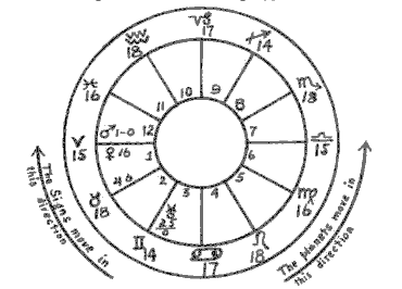 You will readily understand that the signs of the zodiac do not move. Their apparent motion is due to the rotation of the earth, but you will often hear the statement that they do move. Understand this in the same way that you understand the statement that the "sun rises." The sun does not rise, but its apparent rise is caused by the rotation of the earth. Similarly, the signs are said to move, and they appear to move. it is easier and shorter to speak of their moving than it is to enter into a long explanation of the apparent motion. For the same reason we do not quarrel with anyone who speaks of the sun rising. We know perfectly well what he means.