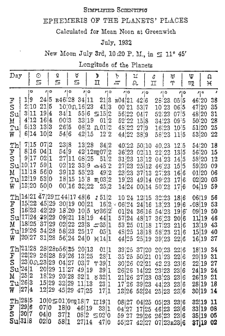 July, 1932 - Longitude of the Planets