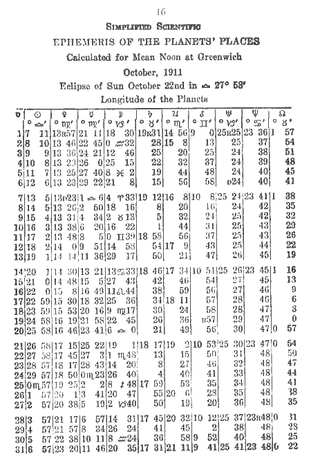 October, 1911 - Longitude of the Planets