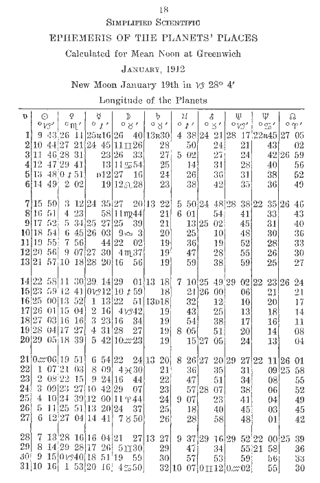January, 1912 - Longitude of the Planets