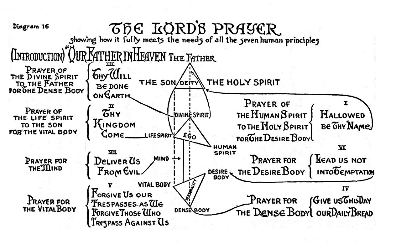 Christ gave to humanity a prayer that is, like himself, unique and all-embracing. In it there are seven distinct and separate prayers; one for each of the seven principles of man — the threefold body, the threefold spirit and the link of mind. Each prayer is peculiarly adapted to promote the progression of that part of composite man to which it refers.