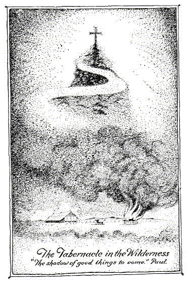 Paul in his letter to the Hebrews gives a description of the Tabernacle and much information about the customs used there which it would benefit the student to know. Among other things note that he calls the Tabernacle "a shadow of good things to come." There is in this ancient Mystery Temple a promise given which has not yet been fulfilled, a promise that holds good today just as well as upon the day it was given. If we visualize in our mind the arrangement of things inside the Tabernacle, we shall readily see the shadow of the Cross. Commencing at the eastern gate there was the Altar of Burnt Offerings; a little farther along the path to the Tabernacle itself we find the Laver of Consecration, the Molten Sea, in which the priests washed. Then upon entering the East Room of the Temple we find an article of furniture, the Golden Candlestick, at the extreme left, and the Table of Shewbread at the extreme right, the two forming a cross with the path we have been pursuing toward and within the Tabernacle. In the center in front of the second veil we find the Altar of Incense, which forms the center of the cross, while the Ark placed in the westernmost part of the West Room, the Holy of Holies, gives the short or upper limb of the cross. In this manner the symbol of spiritual unfoldment which is our particular ideal today was shadowed forth in the ancient Mystery Temple, and that consummation which is attained at the end of the cross, the achievement of getting the law within as it was within the Ark itself, is the one that we must all concern ourselves with at the present time. The light that shines over the Mercy Seat in the Holy of Holies at the head of the cross, at the end of the path in this world, is a light or reflection from the invisible world into which the candidate seeks to enter when all the world has grown dark and black about him. Only when we have attained to that stage where we perceive the spiritual light that beckons us on, the light that floats over the Ark, only when we stand in the shadow of the cross, can we really know the meaning, the object, and the goal of life.