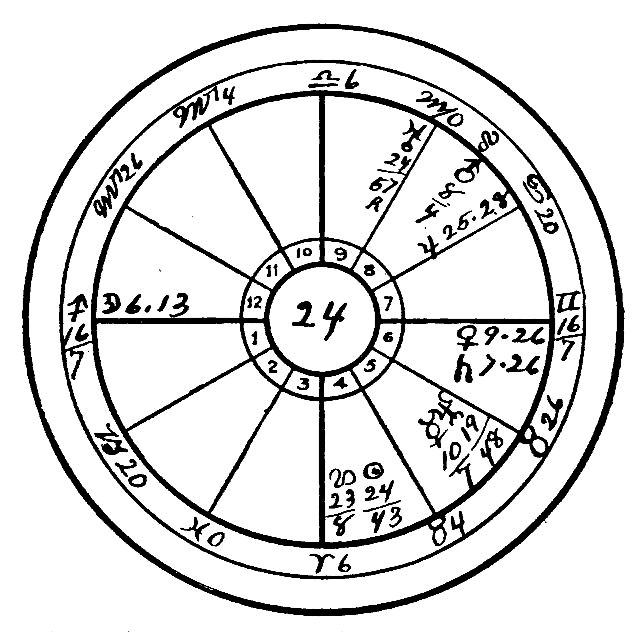 With respect to the mental qualities we find that Mercury is square to Uranus, and the Moon in opposition to Neptune. This makes her skeptical, critical, very peculiar and spasmodic in her mental processes, with an extremely morbid imagination. Uranus is placed in the Fifth House, governing courtship and the relations among the sexes prior to marriage, and therefore, squared to Mercury, it indicates an unconventional turn of the mind, with a tendency to promiscuous relations, involving public criticism and slander. That in itself is an extremely unfortunate configuration and condition in a life, but it is only one of a number of afflictions which point in the same direction, for in the Twelfth House, the house of sorrow, trouble, and self-undoing, we find Mars, the planet of dynamic energy, conjoined with Venus, the planet of love, in the fiery sign Aries, another inflammatory sex condition; and last, but not least, we note Neptune in Taurus, opposition to the Moon in Scorpio, which governs the generative organs. This latter is the worst of all for it makes the mind almost insane upon this subject, conjuring up before the imagination morbid pictures, and where the configuration occurs from the Sixth and Twelfth Houses it is a certain indication of inveterate self-abuse. Naturally such practices in time undermine the health and disease shows itself in the weakest parts of the body according to the indications of the horoscope. In the present case we find Saturn on the cusp of Gemini in conjunction with the Sun. Gemini is the sign which rules the lungs, and the conjunction as we see is almost exact, wanting only 26 minutes. Thus the cold, crystallizing saturnine forces are hardening the lungs and producing the disease we know as tuberculosis, which is slowly sapping her vitality and carrying her toward an early grave. It may be noted in passing that her mother succumbed to tuberculosis at the very moment when she gave birth to this child. Mars by progression has now arrived close to the place of Neptune at birth. This will unfortunately in all probability accentuate the morbid craving indicated by Neptune opposition to the Moon, so that if left to herself the end will not be very far off.