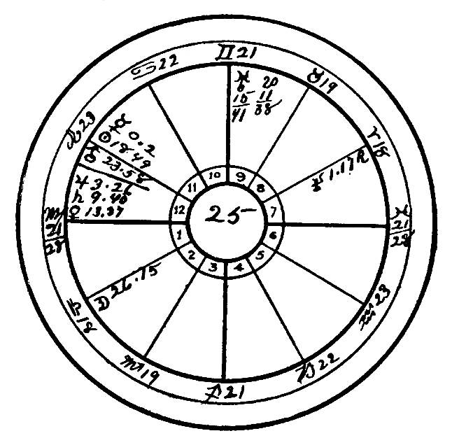 The horoscope is, as you know, the clock of destiny, and the position taken by the planets at birth give certain tendencies for life. From that natal position the planets move on to different positions with every year that passes, as the hands of a clock move around its face; thus they bring to pass events foreshown at birth. Now you will notice that the Sun is in eleven degrees of Libra in this horoscope, so at nineteen years of age the Sun entered the sign Scorpio. At twenty-two it reached the conjunction with the Moon and Venus and a couple of years later the square with Uranus was reached. During this period the unfortunate tendency spoken of developed and the seeds of disease were sown which resulted in a number of operations, both in the lower regions and in the throat, for you must remember that the opposite is always afflicted. The generative organ can never be hurt without in some measures it counterpart, the larynx and throat, also being affected. During the years which intervened between that time and 1914 the Sun had pursued its path through Scorpio, and reached the affliction of Jupiter, which occurs from the sign Leo in 23 degrees. This square was also augmented by the fact that the Moon in its circle around the horoscope had been going through Taurus, so that was an opposition of the progressed Sun and Moon, both of them squaring the planet Jupiter at the same time. The Sun's square to Jupiter will for a few years be an affliction to this poor person. Uranus at birth was also on the Ascelli in Leo, the nebulous spot that is so dangerous to the eyes, and from there it squares the Moon. This, also, is another danger which faces this person, for , as you know, eye trouble is very often the accompaniment of indiscretion.