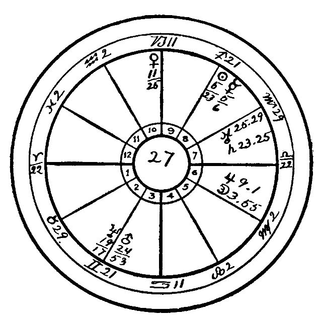 You will notice that this square occurs from the Fixed signs, Leo and Scorpio, and it is therefore a condition which would be very difficult to overcome. Leo governs the heart, and Scorpio the generative organs, and thus her secret is told in the horoscope in unmistakable terms.