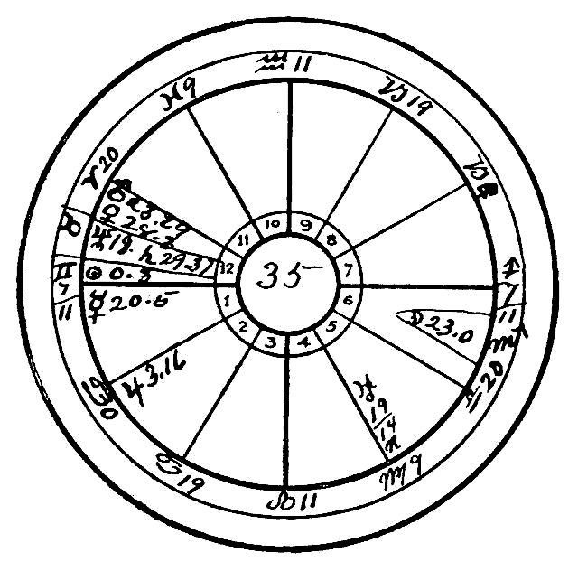 In 1913 the Sun progressed to the conjunction of Uranus and Mars. The aspects of the Sun are always effective for three years, one and one-half years before the aspect is exact, and a like period after. Therefore it was still active in 1914, when the Moon progressed to the conjunction of Saturn and thus enlivened this square to the Sun, Moon and Venus. Neptune, the watery planet, also reached the natal Sun by transit, and the poor soul was released by the total obstruction of the liquids; in other words, the dropsical condition stopped the heart.