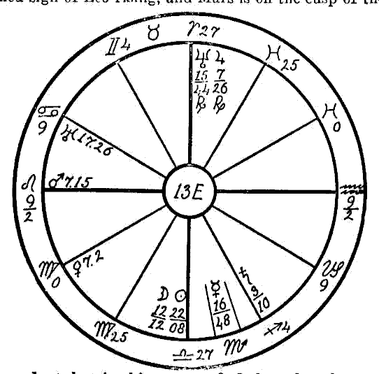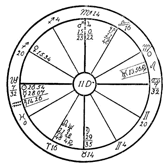 In 1914 we find the progressed Sun in the first degree of Scorpio, and the progressed Moon in the sign Aquarius forming an opposition to the Ascendant and the radical Jupiter in Leo. It is also coming up to a square of the radical Saturn, Mercury, and Uranus in Scorpio. In this same year two new Moons afflicted the three latter planets. The one on January 26th fell in five degrees of Aquarius in opposition to Jupiter and square to Saturn and Mercury. On April 25th the new Moon fell in four degrees of Taurus, square to Jupiter and opposition Saturn and Mercury. This was the time when —