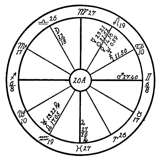 Although we are unable to predict the dates of crises in her illness on account of the lack of the birth hour, still the aspects between the planets in this woman's chart, show sufficiently well the nature of the illness and the yearly crises. We find the erratic and eccentric Uranus in the psychic sign of Cancer, in opposition to Mars, the planet of impulse and recklessness. Uranus is also in opposition to the life-given sun and to Mercury, the planet of reason, both placed in the belligerent and violent sign Capricorn. All four of these planets are square by Neptune in Aries, the sign which rules the head and the brain.