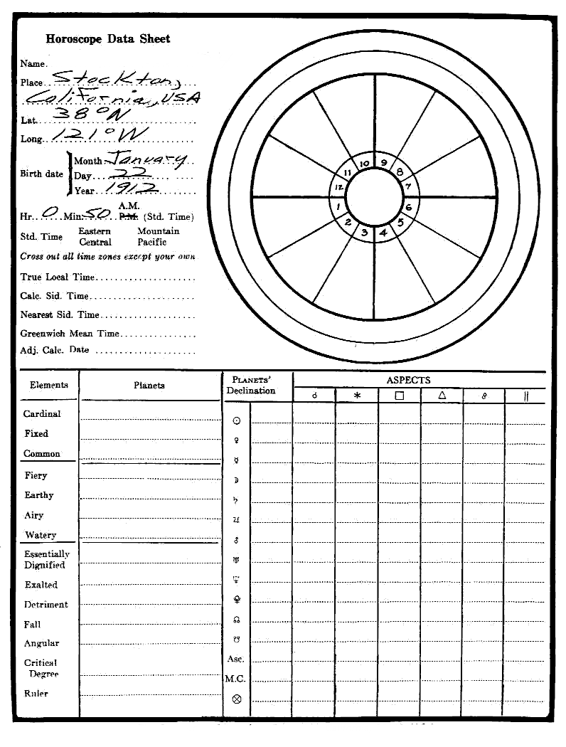 1. When you have studied this Astrology Independent Study Module, please set up the practice horoscope below (Birth Place: Stockton, CA, USA; Lat.: 38 deg. N.; Long.: 121 deg. W.; Birth Date: January 22, 1912; Birth Time: 0:50 A.M.). (Optional)