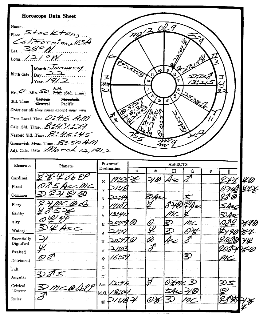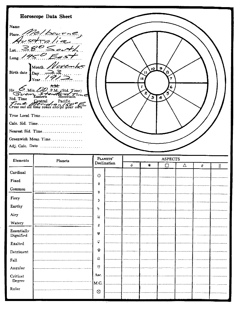 1. When you have studied this Astrology Independent Study Module, please set up the practice horoscope below [Birth Place: Melbourne, Australia; Lat.: 38 deg. S.; Long.: 145 deg. E.; Birth Date: November 23, 1912; Birth Time: 6:00 P.M.], and email it to us. (optional)