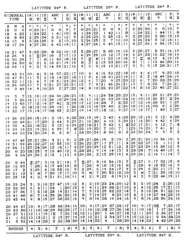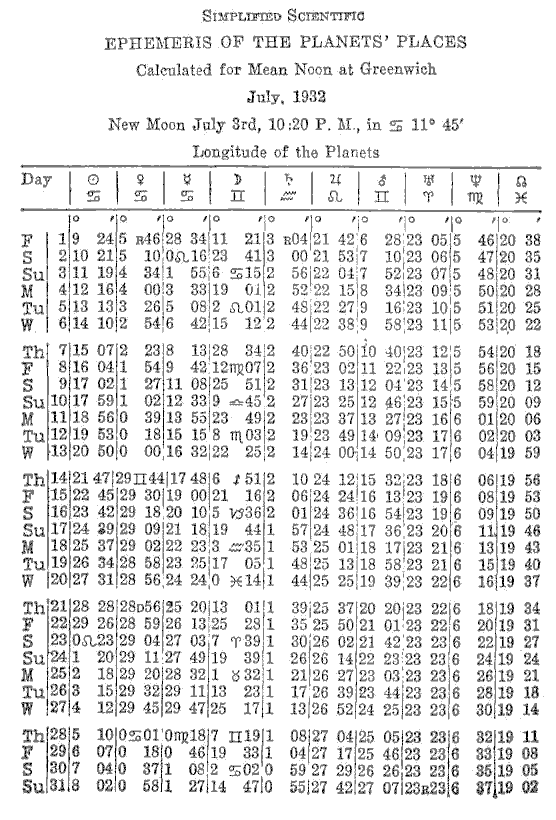 The following tables are the longitudes of the planets, the declinations of same and the sign, degree and minute to be placed on the necessary six houses in order to erect the horoscope of a male, born July 4, 1932; 2:15 A.M., Standard Time, Los Angels, California. (optional)