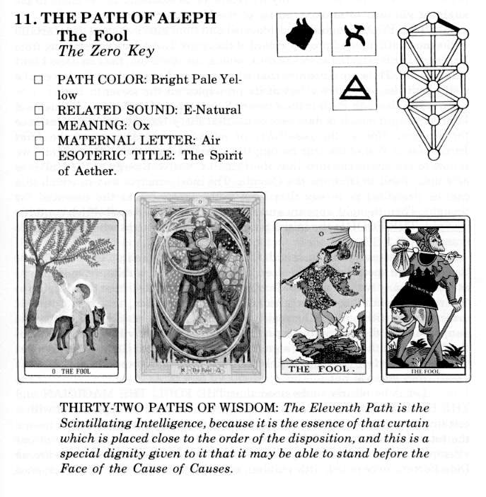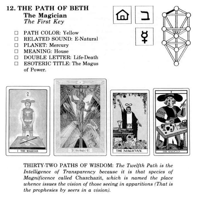 The Tarot glyph for Aleph is termed "The Magus" or "Magician," who is shown raising a staff or wand toward heaven with one hand while he points downward with the other. Various magical implements lie before him on an altar, emblematic of the spiritual powers possessed by the True Man (Virgin Spirit). With these powers he is able to descend into the lower worlds, and with these powers he rises out of them, returning to his Father in heaven. They are the powers which he had "when the morning stars sang together."