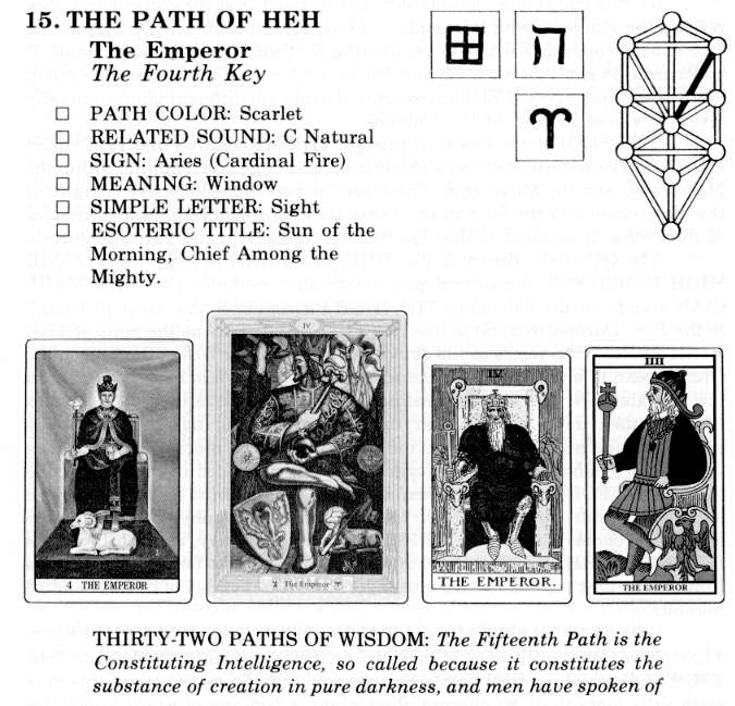 In the Tarot the letter He is represented by a masculine figure, and the numerological character of the number 5 is that of mobility, movement, change, variety, progression and the ability to achieve high attainment. Although the pentagram (five-pointed star) is its perfect symbol, it is also symbolized by a square with a central point, which is 4 plus 1, the perfect square with I added.