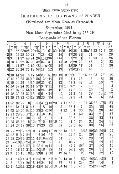 Now suppose that the Moon is in Aries 26 at one noon and moves to Taurus 8 by the next noon, and you wish to find out how far she has gone. You wish to subtract Aries 26 from Taurus 8 thus: