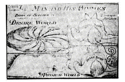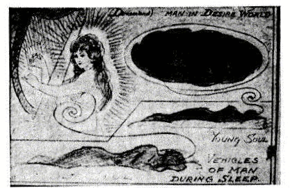 On stereopticon slides which Max Heindel had prepared, the desire body is shown floating like a balloon over the sleeping body, attached by the Silver Cord which pinches into the pattern of the sixes midway between the desire body and physical body. He has said that there is no difference between sleep —