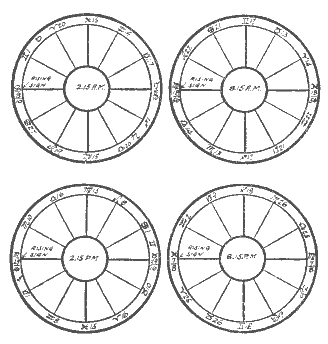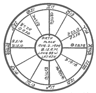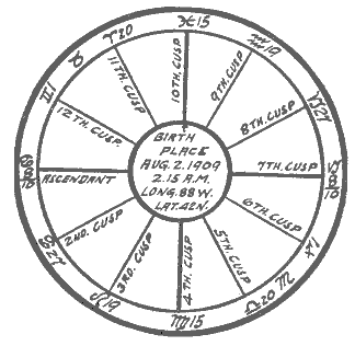 The horoscope has now been cast and is complete. Most astrologers now start to read, but to do this work thoroughly it is necessary to make an index such as will be found in a later chapter. In order to make the student thoroughly conversant with the manner of casting a horoscope we will first complete the figure cast in part for Aug. 2, 8:15 P.M., for that horoscope offers certain peculiarities worthy of illustration.