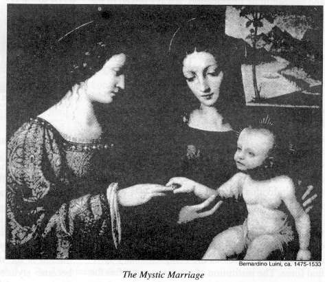 In the Christian tradition, an idea that has served as a particularly fertile subject for the artistic imagination is the mystic marriage, which, over time, became stylized as a depiction of the bride of Christ, named Catharine, meaning "the pure one," proffering her hand to be ringed by the infant Christ (Jesus) Child. Such a popular representation conveyed more esoteric truth and profundity than most artists or viewers consciously realized.