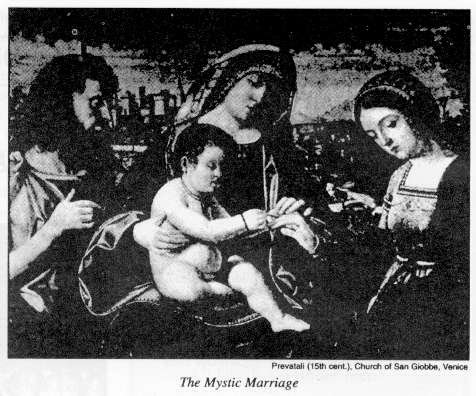 The marriage of St. Catharine to Christ was the subject for a remarkably large number of painters, including Carlo Crivelli, Albrecht Durer, Jan Van Eyck, Pinturicchio, Raphael, Hans Memling, Fra Angelico, Bernardino Luini, Andrea del Sarto, Ghirlandajo, Fra Bartolommeo, Borgognone, Paul Veronese, Parmigianino, Correggio, Murillo, and Tintoretto. Obviously, more was intimated in these representations than meets the eye. They satisfied the deep surmise in their viewer that a special union could and does take place between the Christ and the pure and devoted soul.