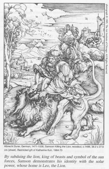 The story of Samson is another phase of the solar myth. As long as Samson's hair was allowed to grow, his strength would increase. Samson is the Sun, and its rays represent Samson's hair. From the winter solstice in December to the summer solstice in June the Sun's rays grow, and it gains in strength with every day. This frightens the "powers of darkness," the winter months, the Philistines, for if this Light Bringer continues to reign, their kingdom will come to an end, and they counsel together against Samson to discover wherein his strength lies. They secure the cooperation of the woman, Delilah, which is the sign Virgo, and when Samson, the Sun, passes through that sign in September he is said to have laid his head on the woman's lap and to have confided his secret to her.