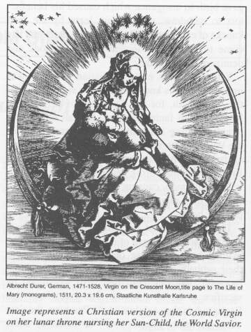 The saviors were all born of an immaculate virgin, at the time when darkness is greatest among mankind, as the Sun of the coming year is born, or begins its journey on the longest night of year, when the zodiacal sign Virgo, the Virgin, stands on the eastern horizon between 10:00 and 12:00 P.M. in all latitudes. She remains as immaculate as ever after she has given birth to her sun-child; hence we see the Egyptian goddess Isis sitting on the crescent Moon nursing her divine babe Horus; Astarte, the immaculate lady of Babylon, with her babe Tammuz, and a crown of seven stars over her head; the lady Devaki in India with her infant Krishna; and our own Virgin Mary, giving birth to the Savior of the Western World under the Star of Bethlehem. Everywhere the same story: the immaculate mother, the divine babe, and the Sun, Moon, or Stars.