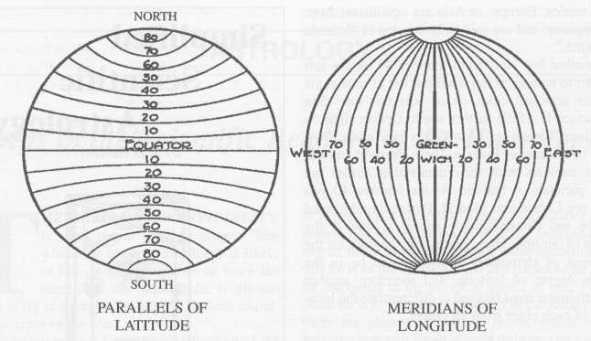 This is accomplished by dividing the Earth from pole to pole by another set of imaginary circles called meridians of longitude, shown in the above chart running the north-south axis. They are so called because all places located along such a circle have noon at the same instant, regardless of how far they are from the equator or whether near the north or south pole. Now look again at your map of Europe. There you will see numbered lines running from the top of the map to the bottom. These are meridians of longitude. One is numbered 0. If you follow that line you will find London, and close thereto a place called Greenwich. That is the location of the world's greatest observatory, and for purposes of astronomical calculation all places on Earth are considered as being so many degrees west or east of Greenwich. Thus, by latitude we obtain the location of a certain place north or south of the equator. By longitude we designate its position east or west of Greenwich.