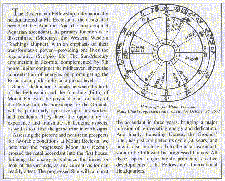 Why at this precise time? Because the planetary configuration was most propitious for initiating and sustaining the work of this spiritual center. It is instructive to note that both Fellowship and Grounds horoscopes show Jupiter as the most elevated planet, and in both the sun and mercury are in conjunction—in 8th house (regeneration) Leo for the former and in 9th house Scorpio (regeneration) in the latter.